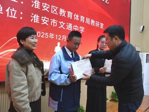 活动现场举行了隆重的颁奖仪式。颁奖结束后,区教研室副主任、初中英语教研员刘继娟作总结发言。她首先向精心组织赛事的文通中学、专业评审的评委、悉心指导的老师及全力以赴的参赛选手致谢。她表示,比赛中15个涵盖城市情怀、红色传承、生态保护等主题的演讲,充分展现了淮安初中生扎实的英语功底与昂扬向上的青春风貌。她寄语参赛同学以此次比赛为契机,保持英语学习热情,用语言传递思想、架起沟通桥梁。