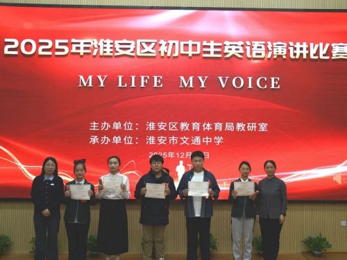 冬日微雨,激荡青春风采;英语旋律,奏响文化乐章。为激发全区初中生英语学习兴趣,营造浓厚的英语学习氛围,搭建展示自我、提升英语综合运用能力与核心素养的平台,近日,2025年淮安区初中生英语演讲比赛在文通中学圆满落下帷幕。本次比赛由区教研室统筹组织,文通中学承办,各初中校积极响应、层层遴选、优中选优,最终15位优秀选手同台竞技,展开了一场精彩绝伦的英语语言盛宴。